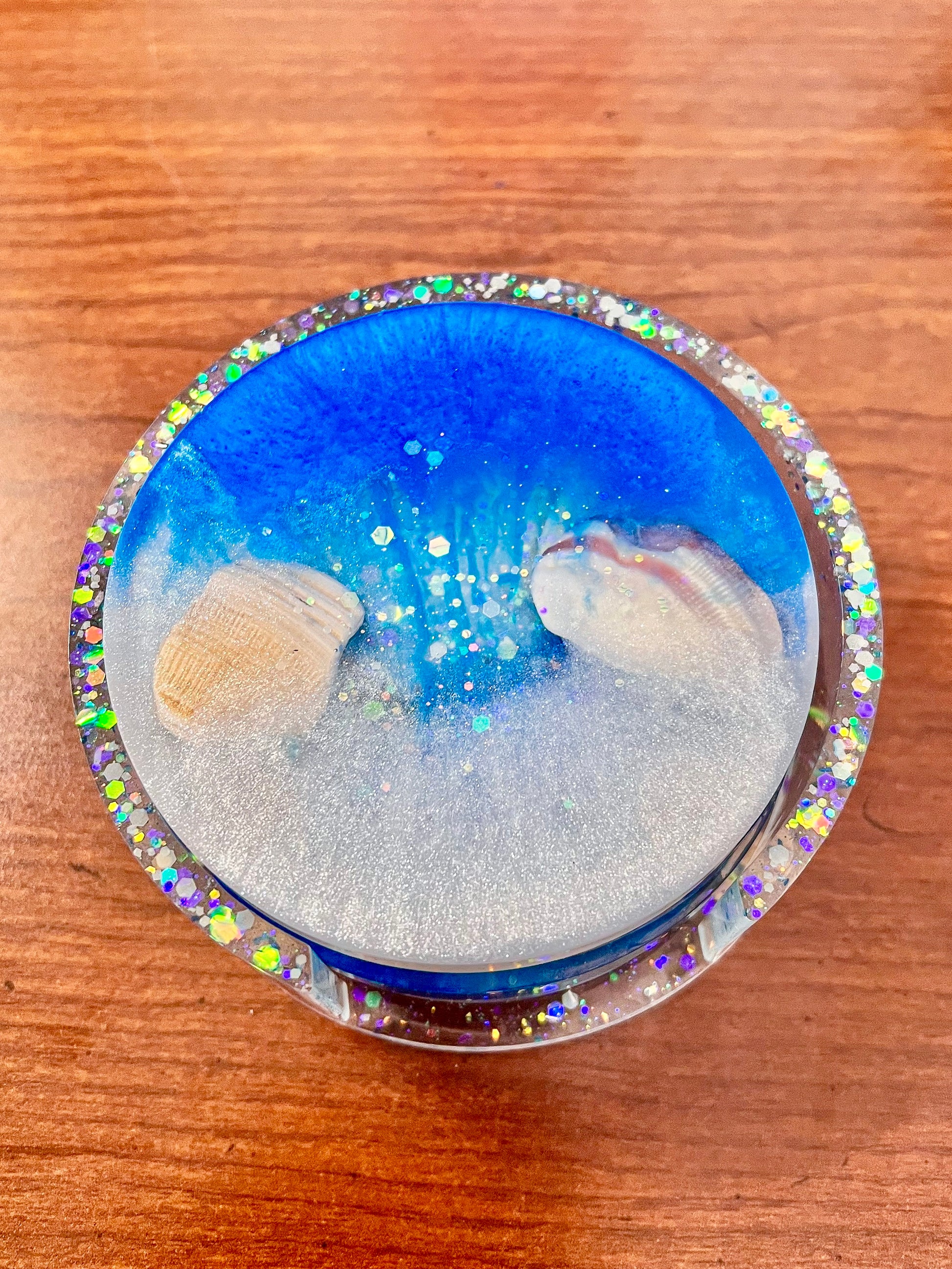 Let’s bring the ocean to your coffee table with these handcrafted coasters + base, each embedded with genuine Florida seashells I found a couple years ago . The royal blue, white, and clear hues dance with mica powder sparkles, while a touch of glitter captures the shimmer of sunlight on the waves. This set of four circle coasters isn't just a functional piece; it's a conversation starter and a piece of art. A one of a kind beauty!!! 💙🤍