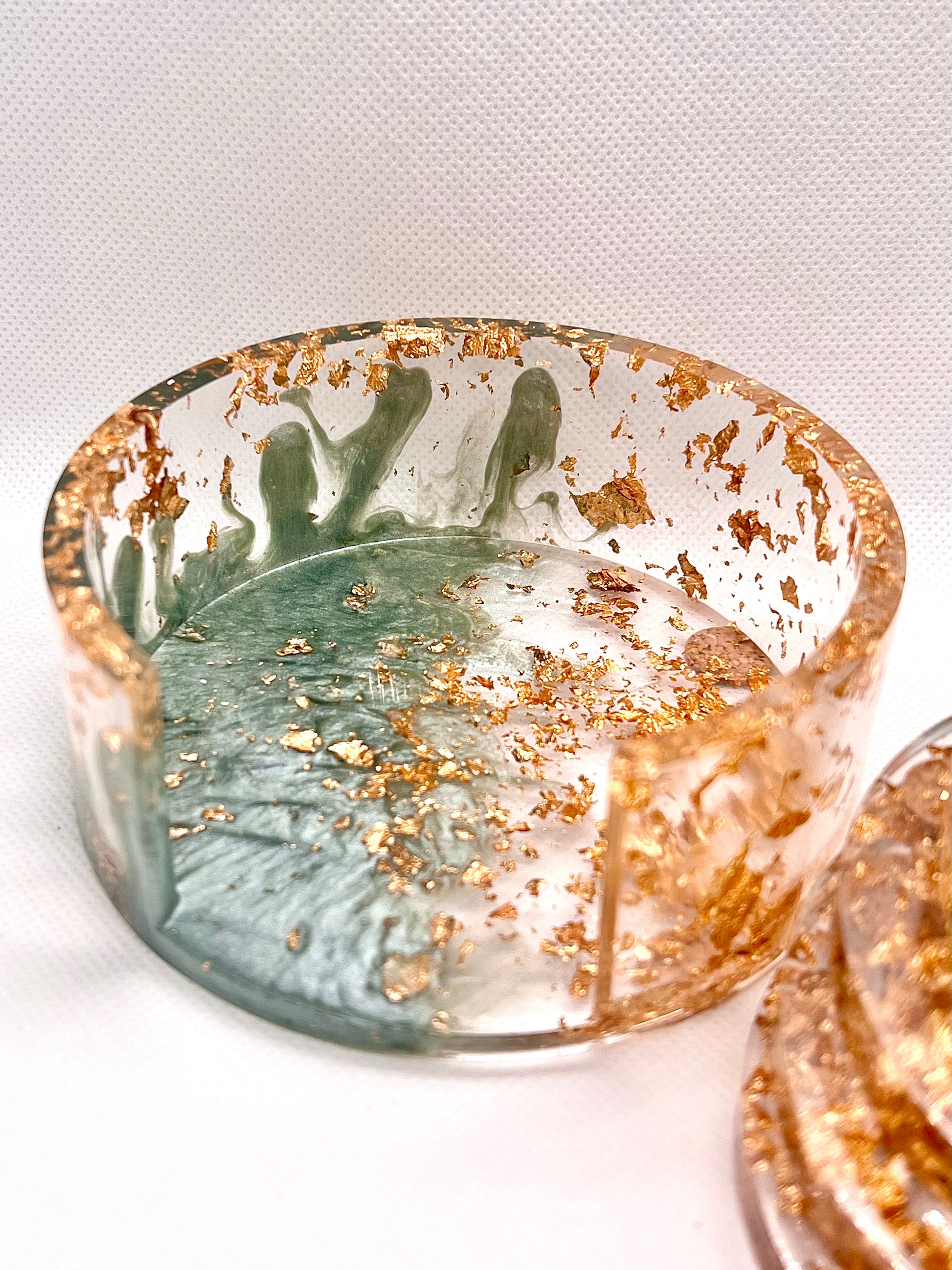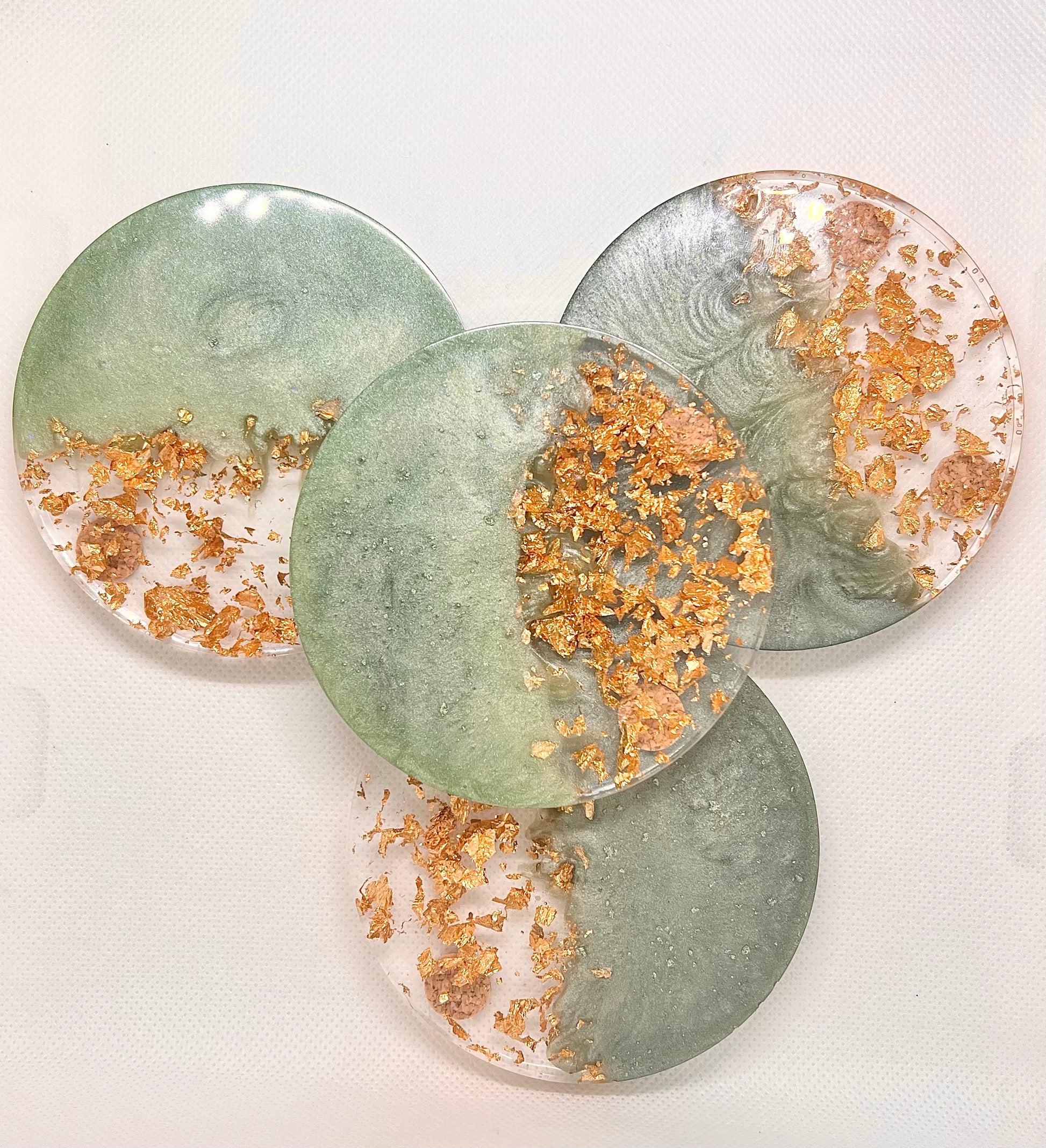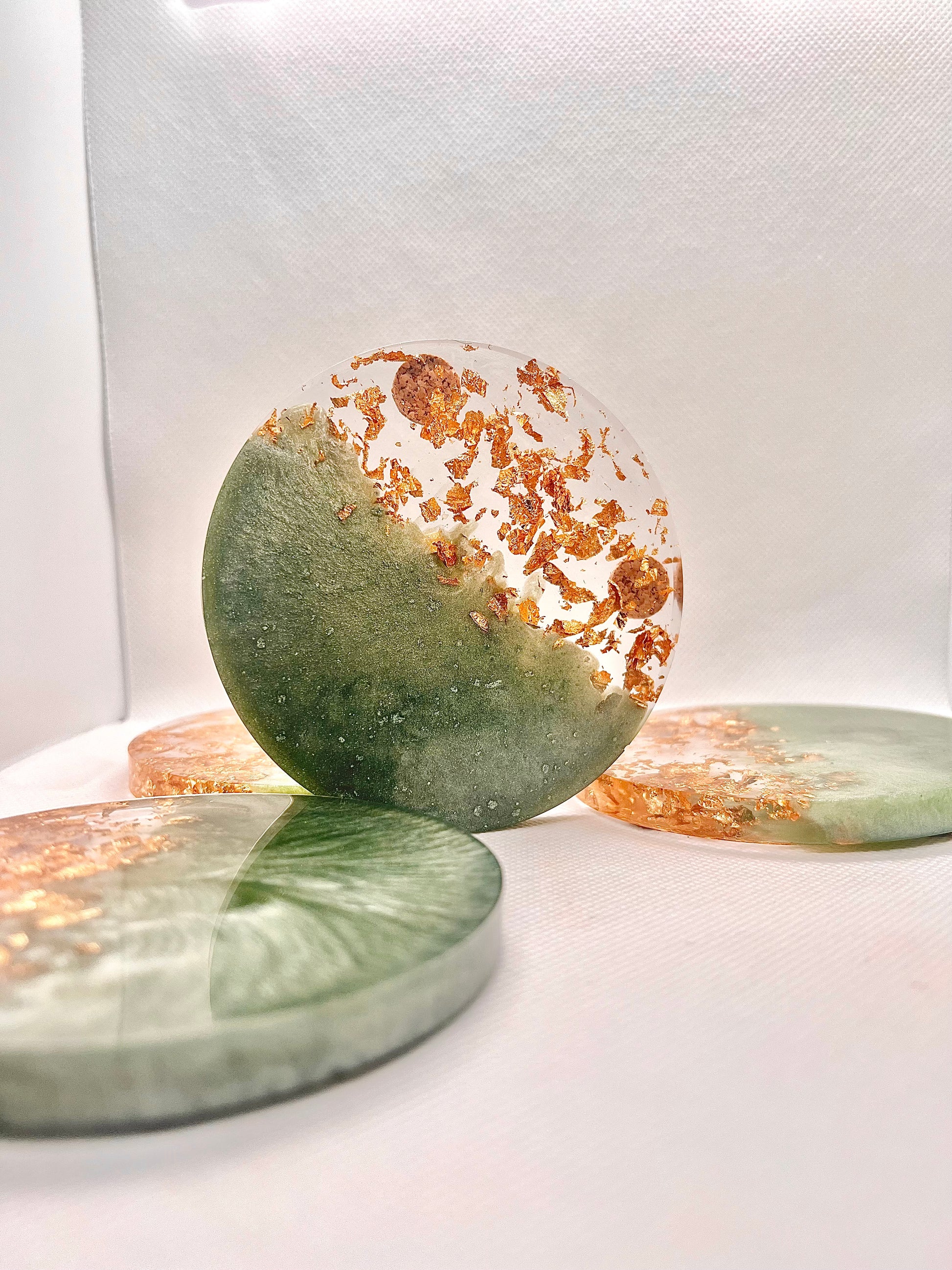 Time to add a dash of elegance to your table with this set of four handcrafted coasters. Each one is a work of art, featuring a unique blend of gold flakes and a mix of sage green, & black mica powder. The design is split down the middle, with one side showcasing the gleaming gold in clear resin, and the other displaying the serene colors.