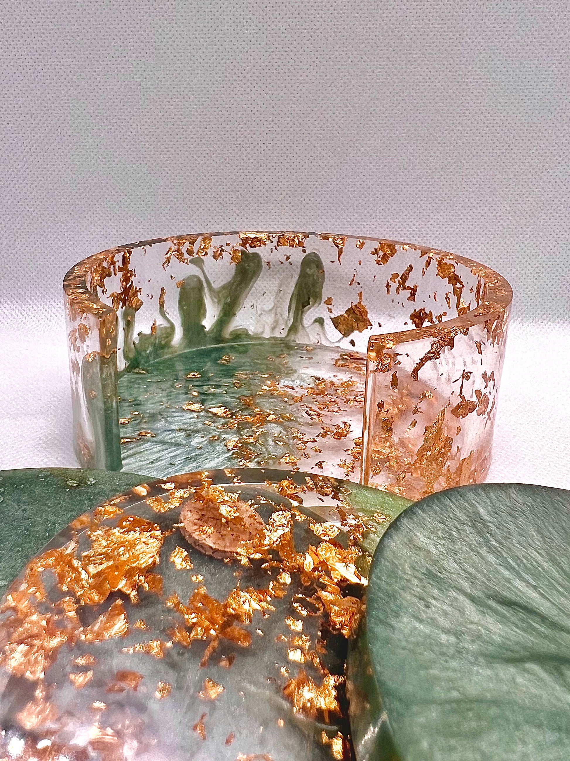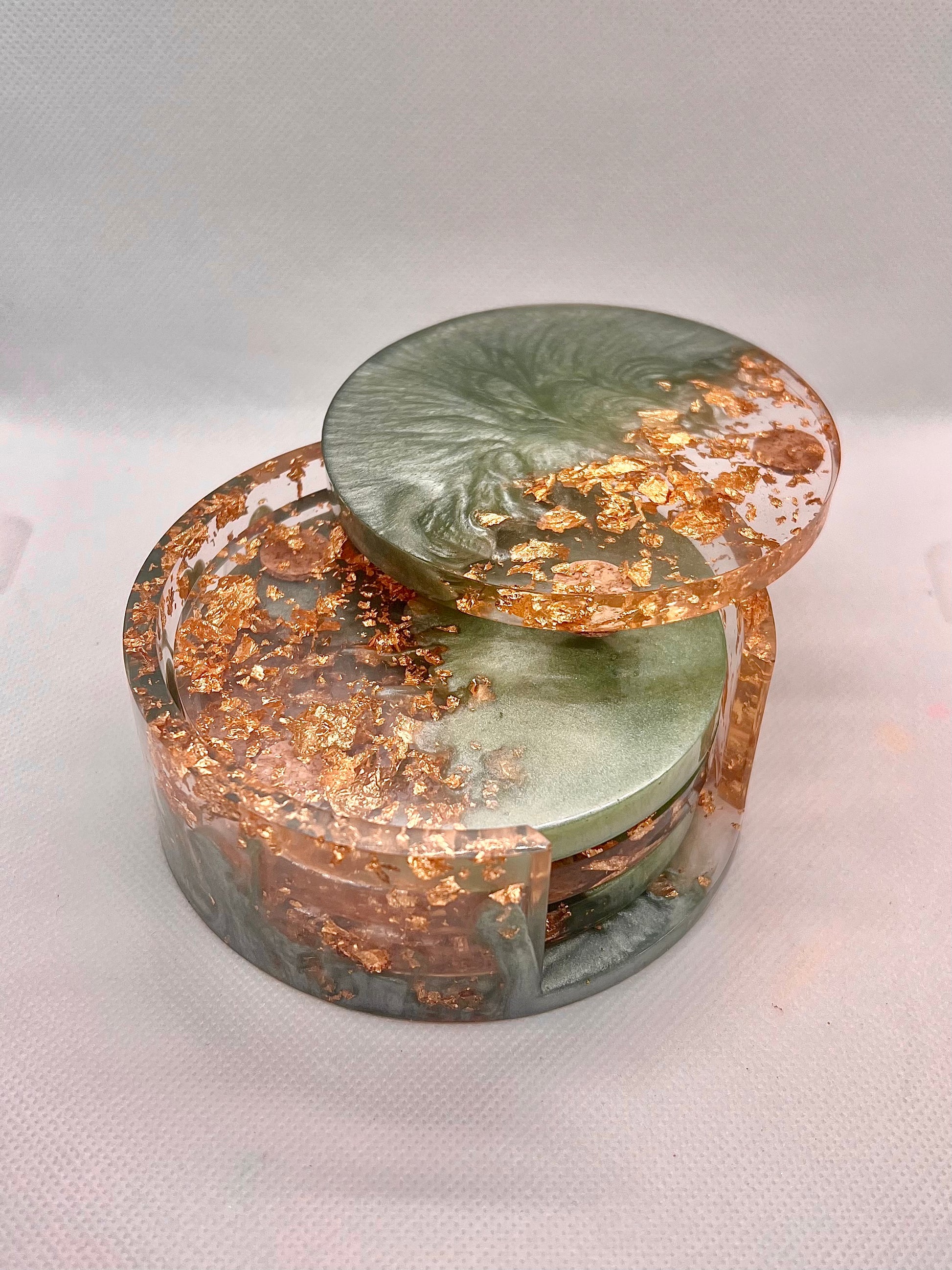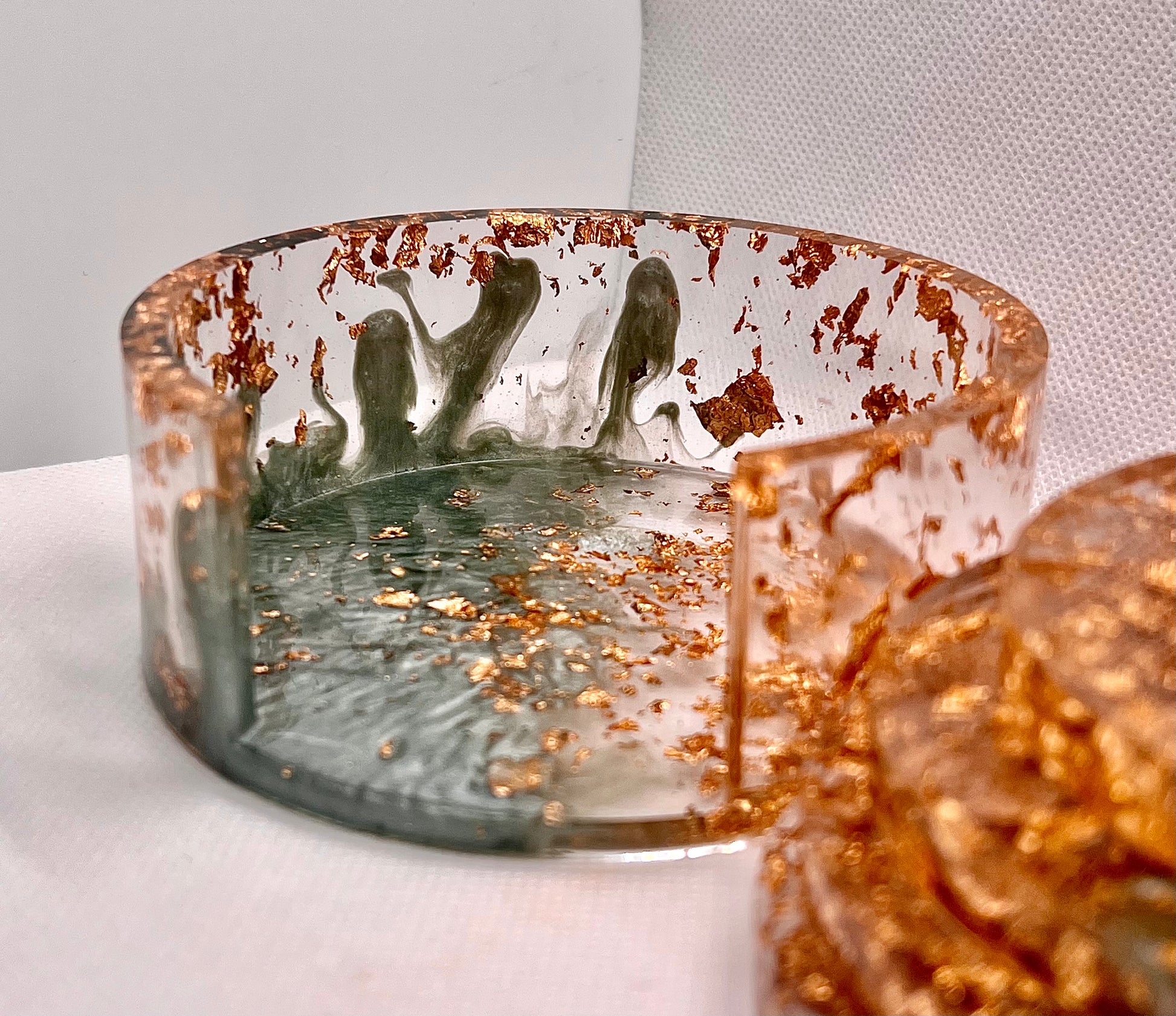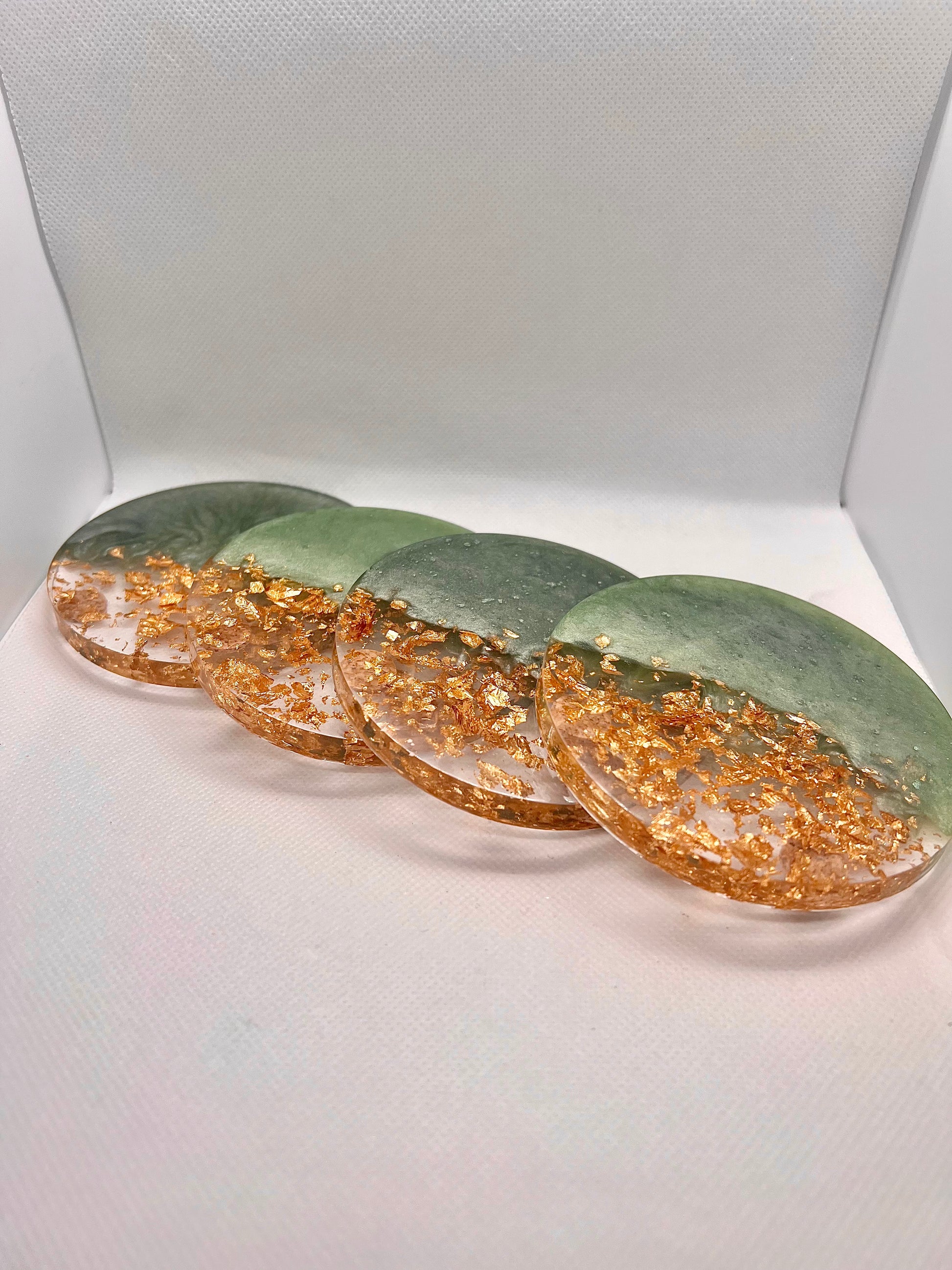 Time to add a dash of elegance to your table with this set of four handcrafted coasters. Each one is a work of art, featuring a unique blend of gold flakes and a mix of sage green, & black mica powder. The design is split down the middle, with one side showcasing the gleaming gold in clear resin, and the other displaying the serene colors.