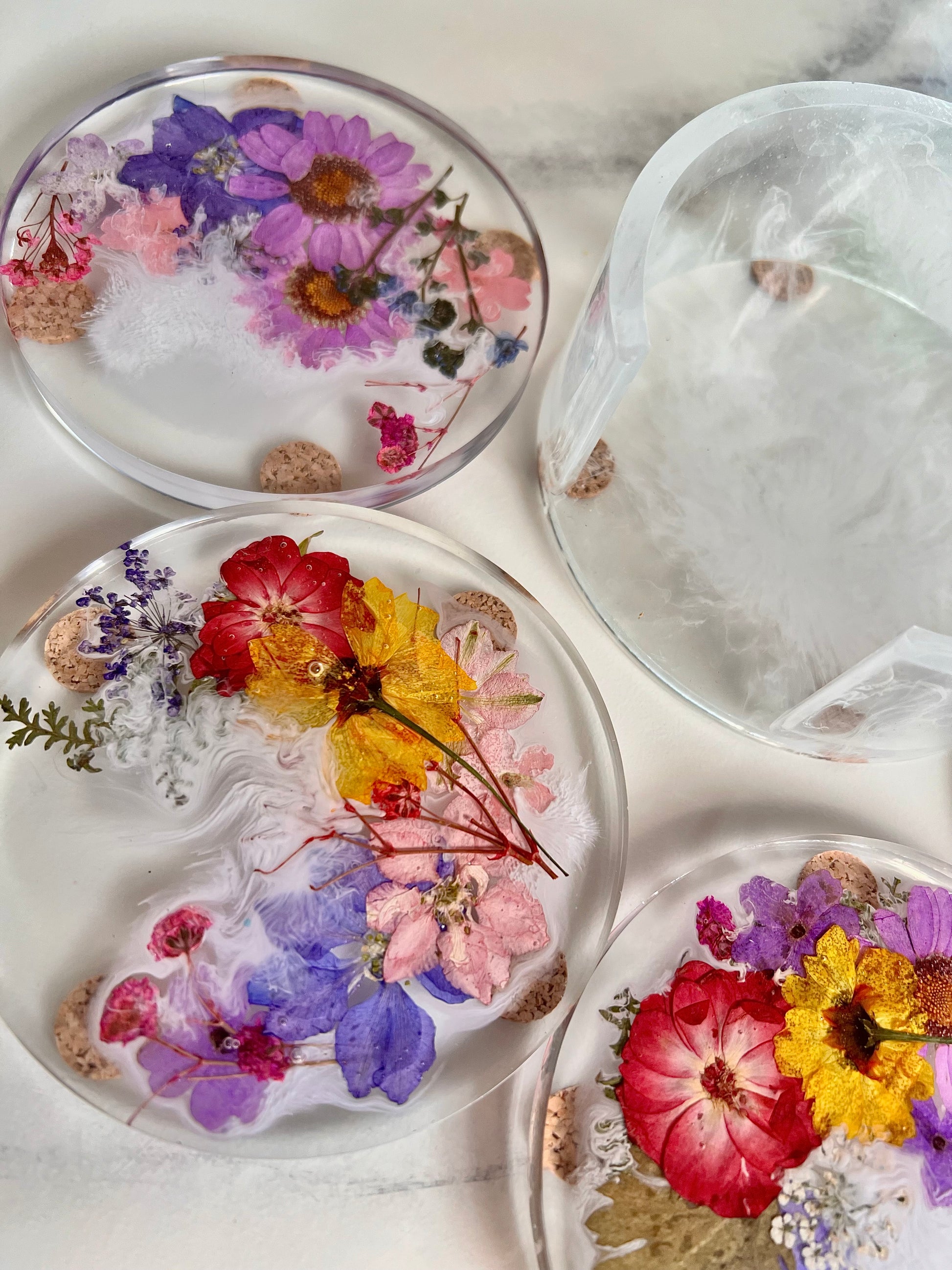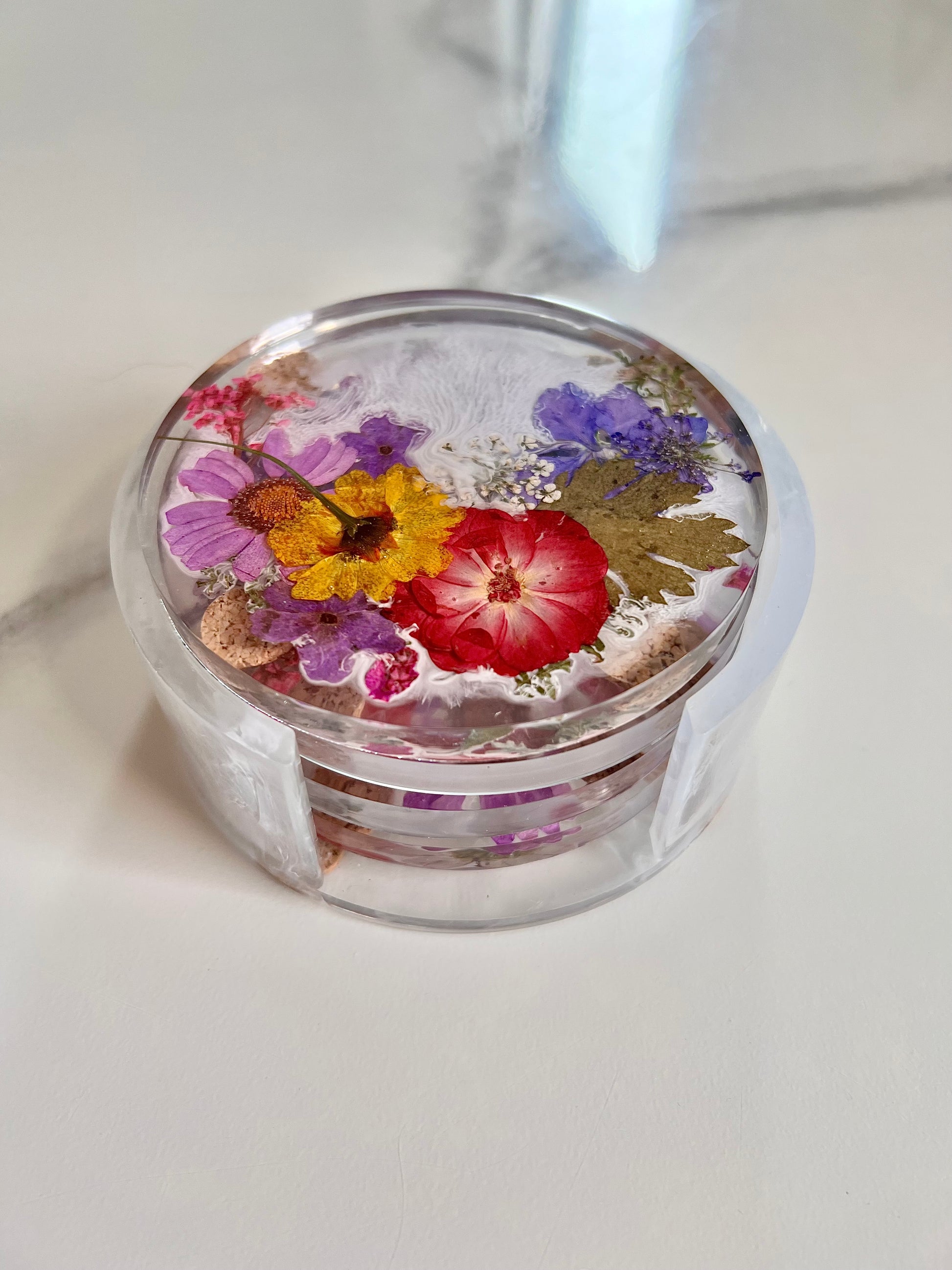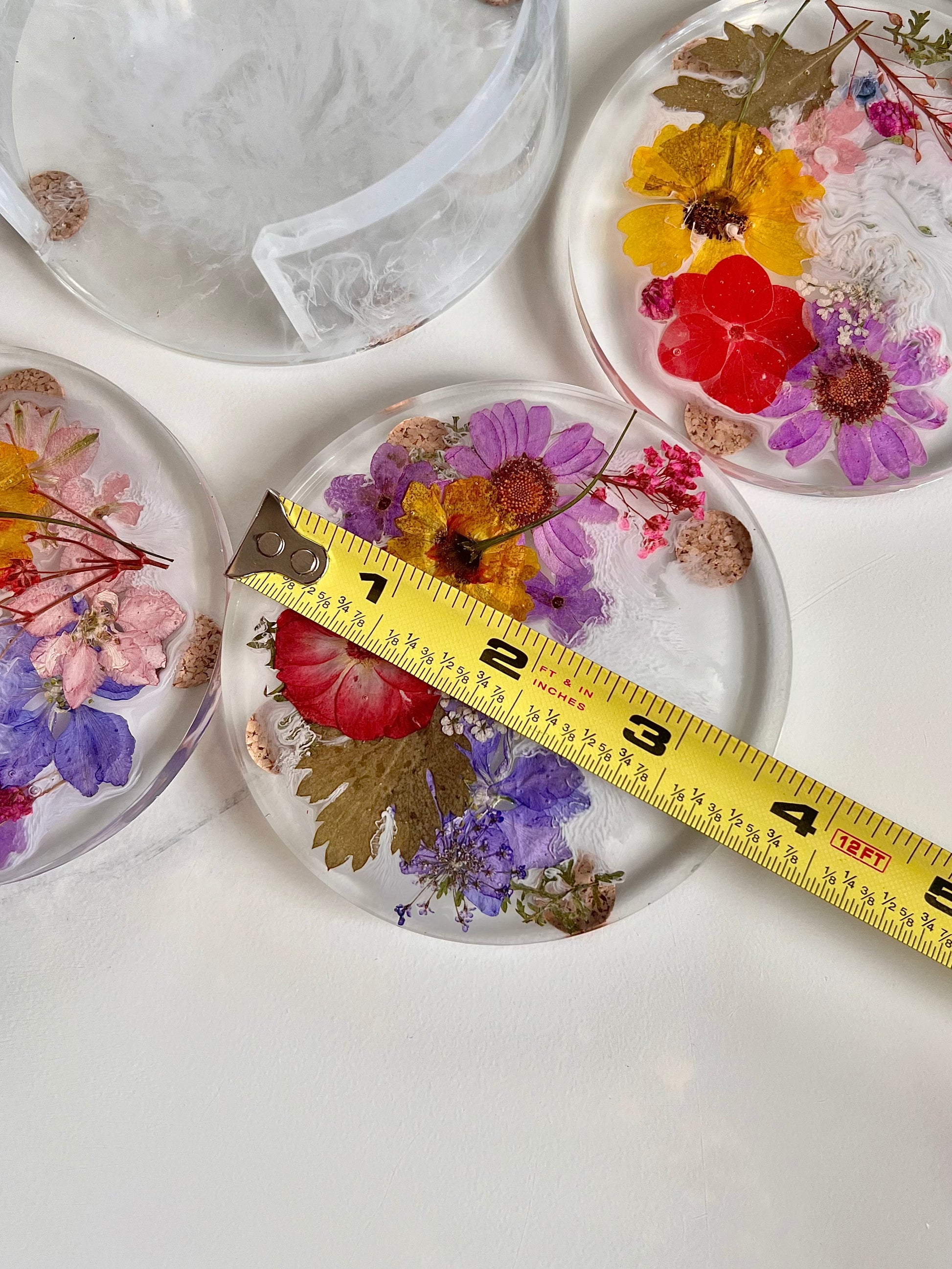 Step into a floral fantasy with my 'Blossom Banquet’ coaster set. This set has real dried flowers with some white color dye. Everything blends beautifully together, these really scream SPRING!