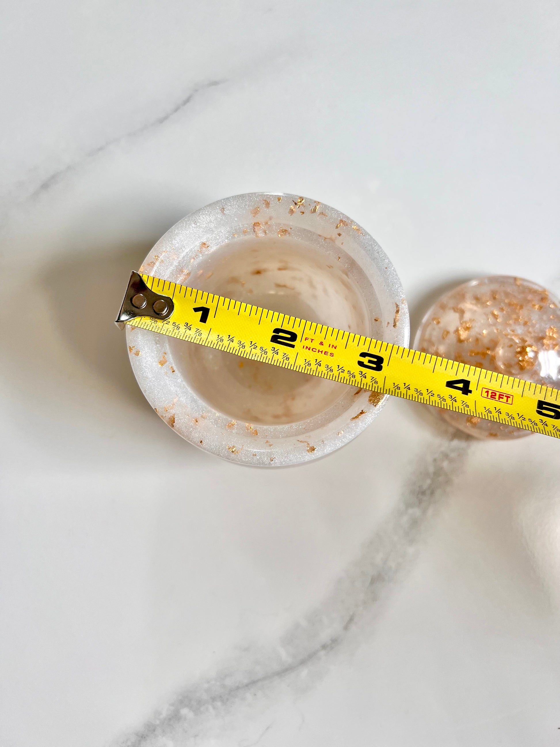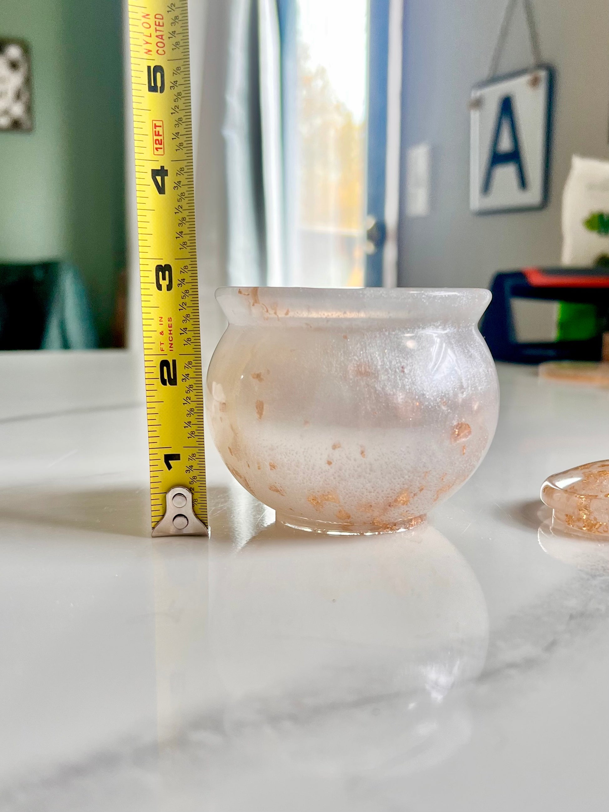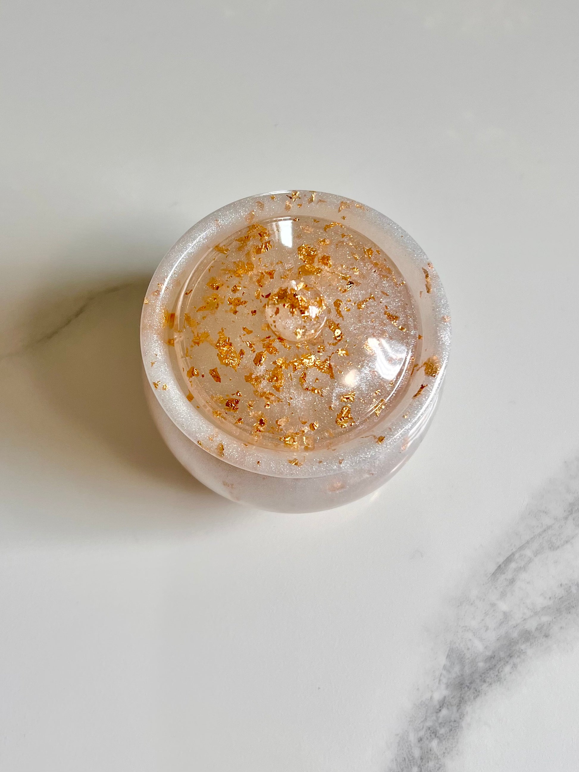 This piece is absolutely beautiful, it’s also my first cup and lid piece I’ve ever made. It’s filled with gold flakes and white mica powder. Super stylish and can be used as a sugar jar, jewelry holder, or whatever you want!!