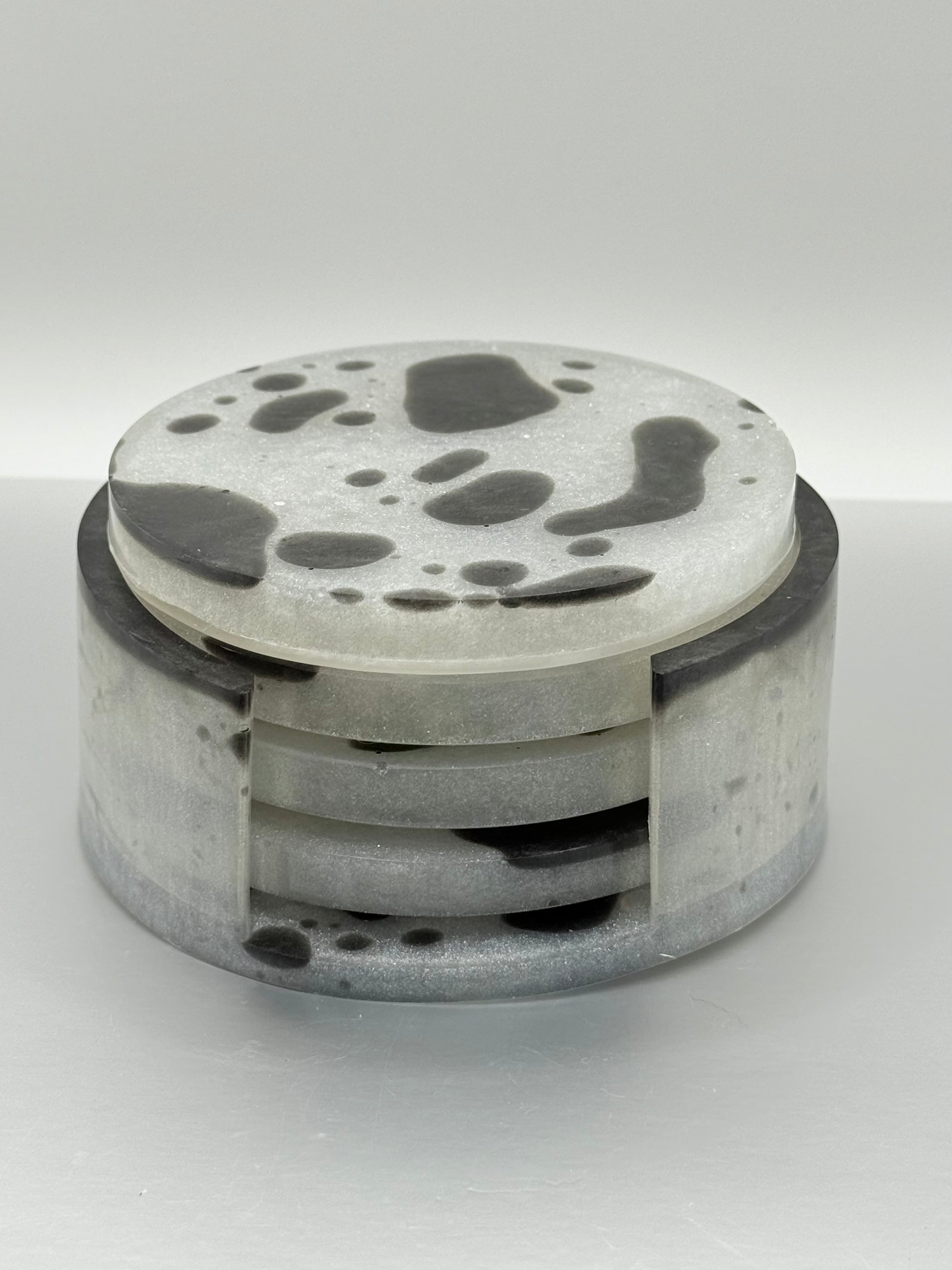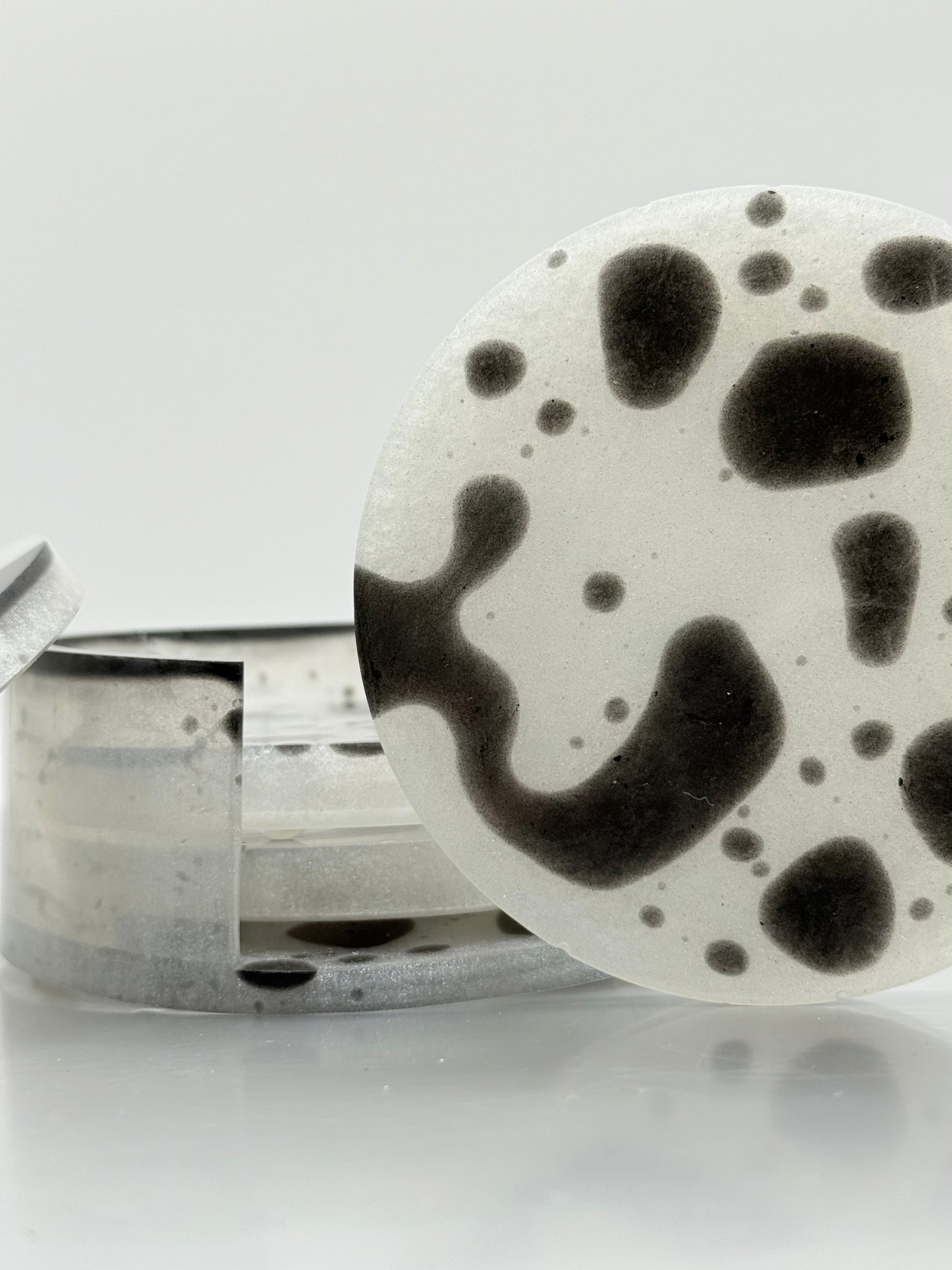 Introducing my new Cow Coaster Set! This charming 4-piece set of circle coasters, complete with a stylish base, is crafted with a unique blend of white and black mica powder, creating a stunning Cow print design. Perfect for adding a touch of elegance and fun to your home decor, these coasters are not only functional but also a delightful conversation starter. Protect your surfaces in style with my Cow Coaster Set – a must-have for any animal print enthusiast!