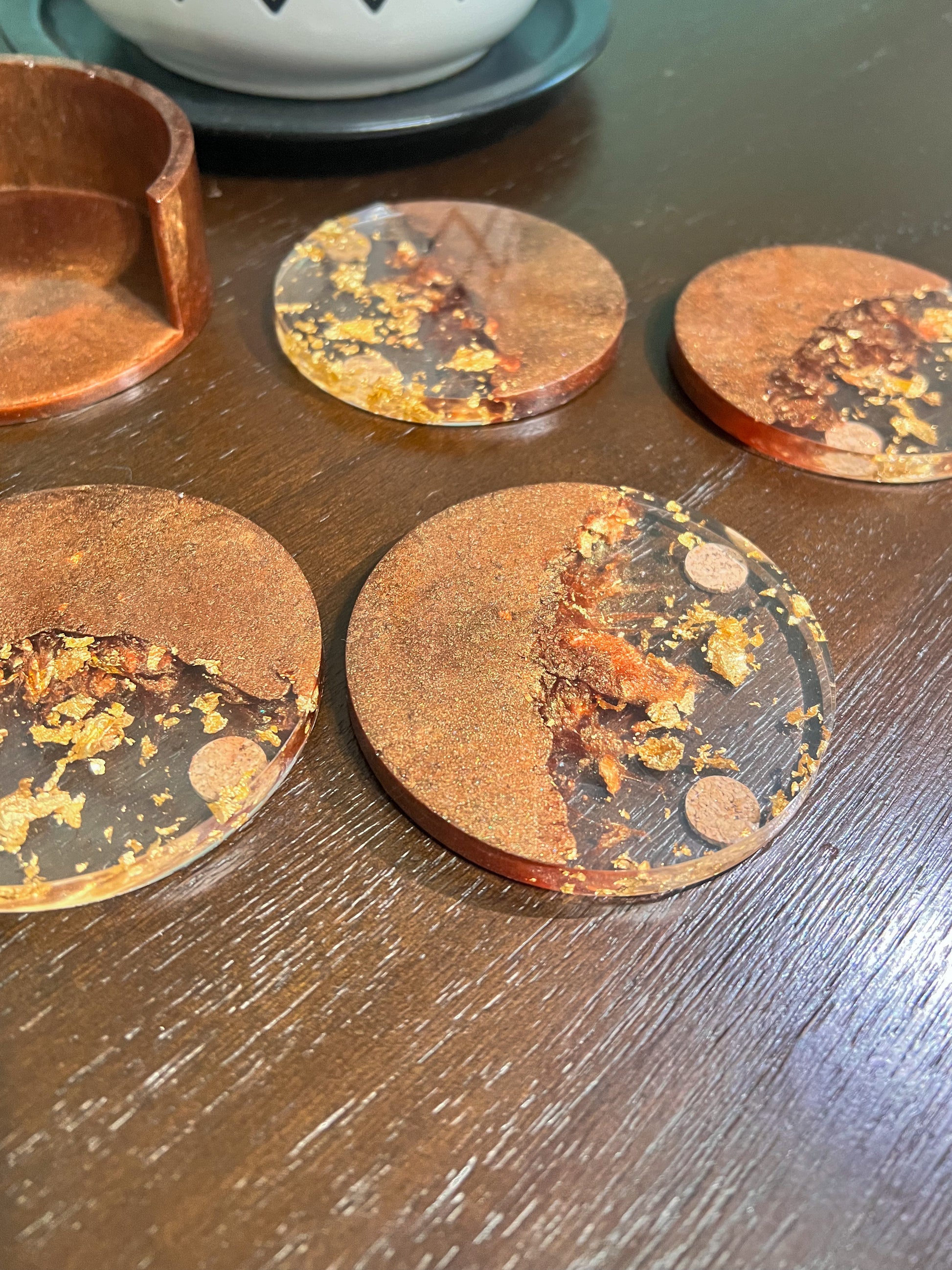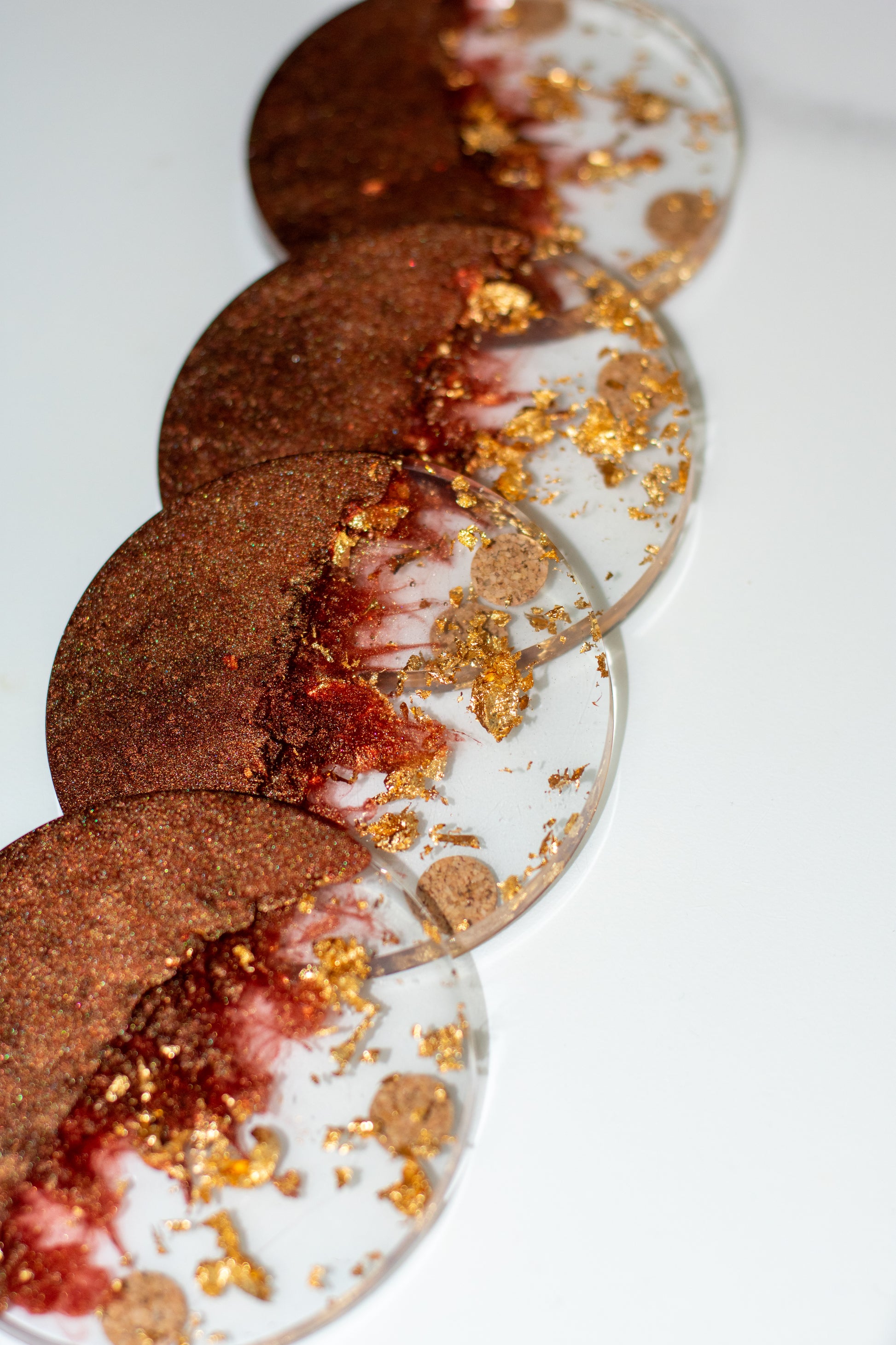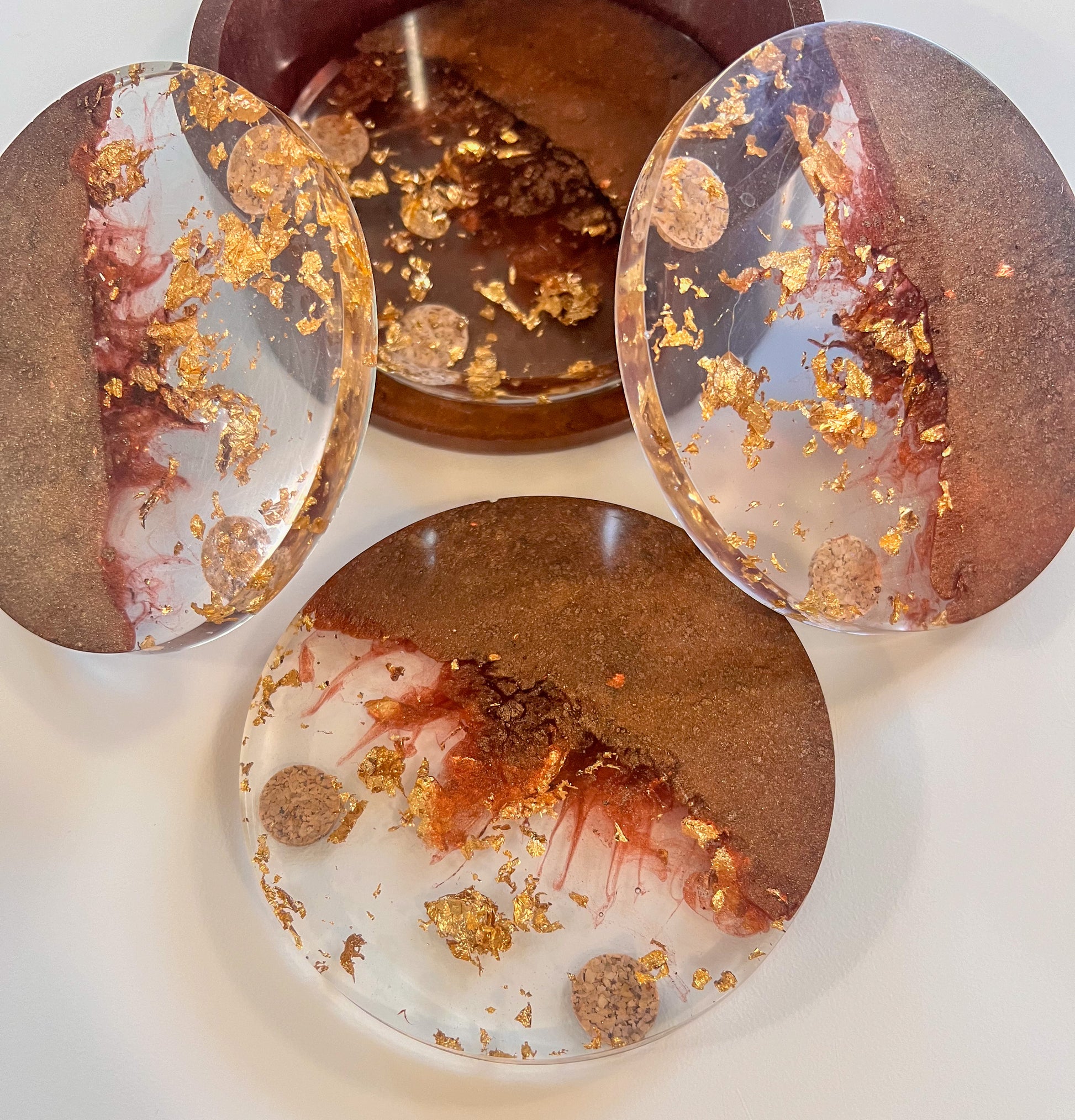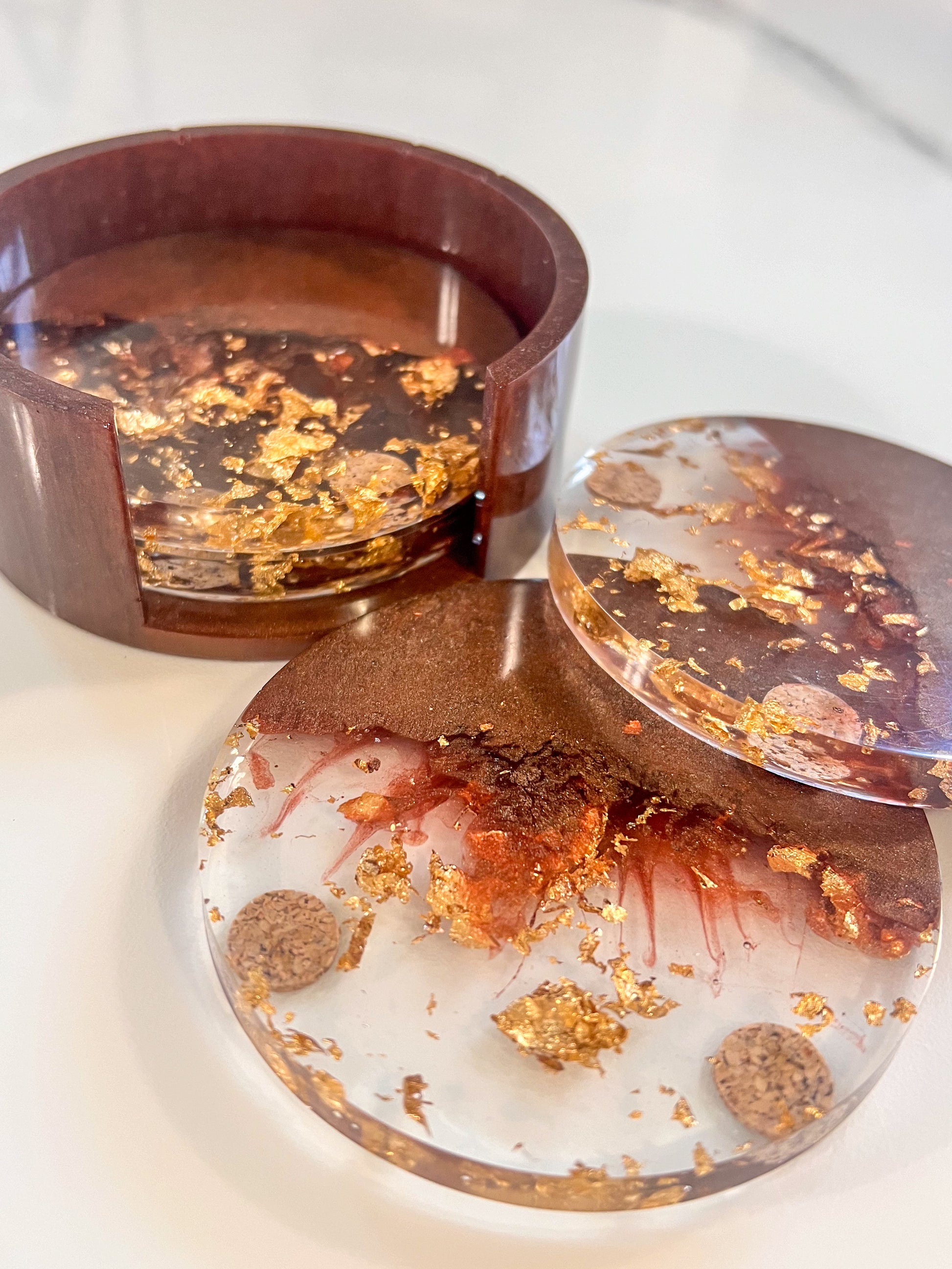 Golden Brew Coasters, a set of four coasters with a matching base that will elevate your home decor. Each coaster is a unique blend of clear resin embedded with shimmering gold flakes, paired with a rich coffee-colored mica powder. The base, crafted entirely in a luxurious coffee brown, perfectly complements the coasters, making this set a stunning addition to any table setting. Whether you're enjoying a morning coffee or an evening drink, the Golden Brew Coasters add a touch of elegance and sophistication. Make every sip special with these beautiful, handcrafted pieces. Order now and bring a golden touch to your home!