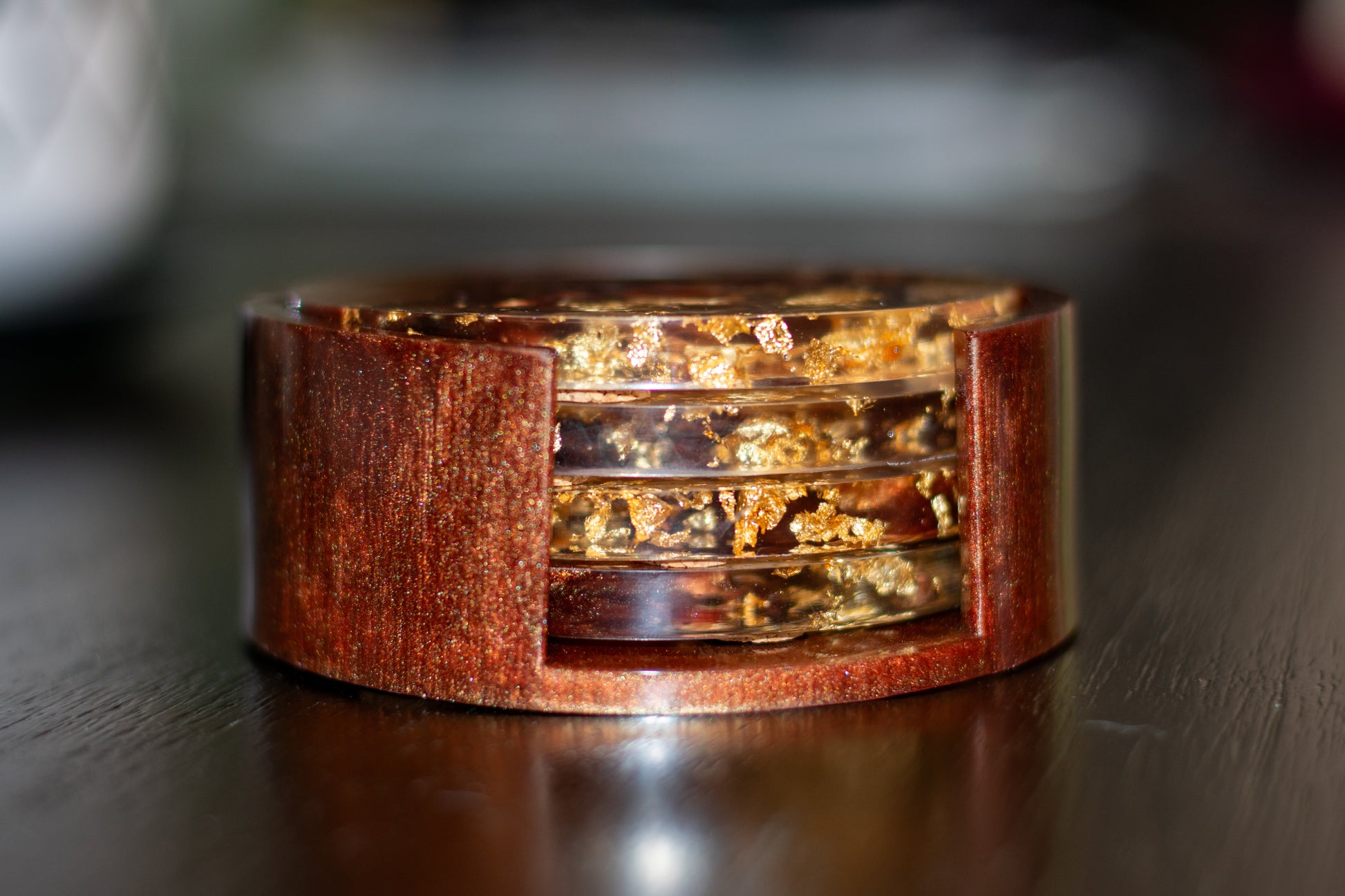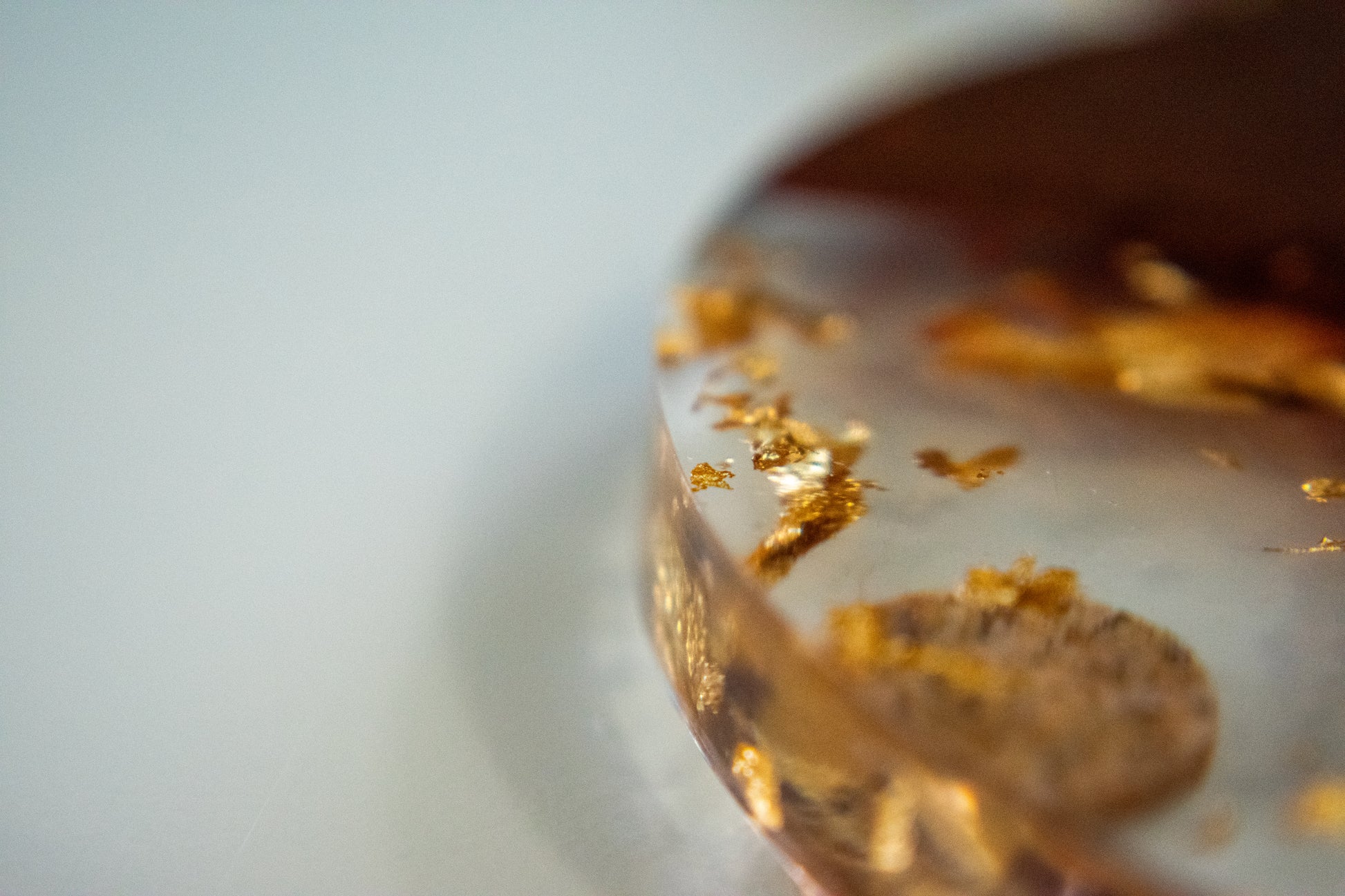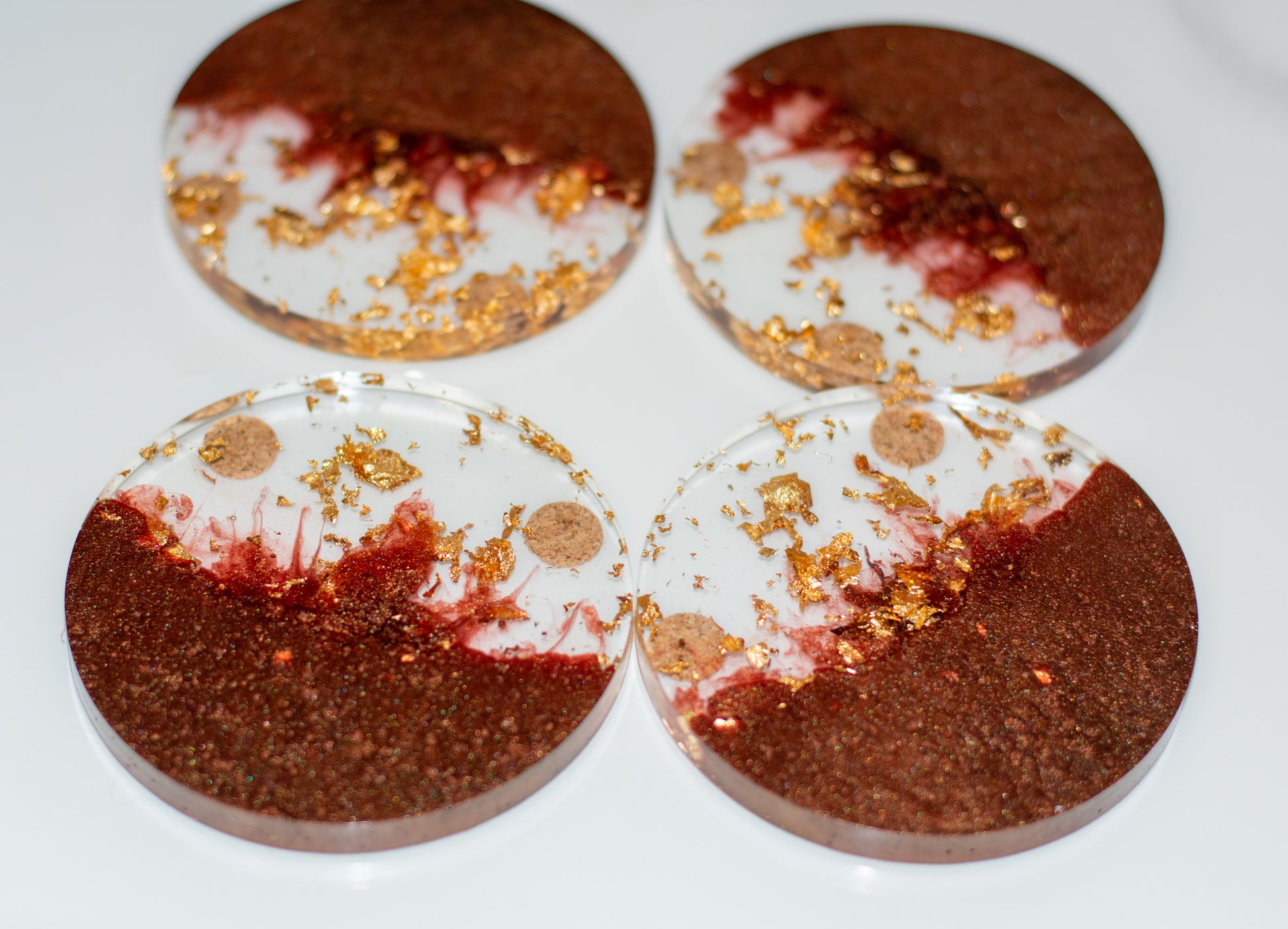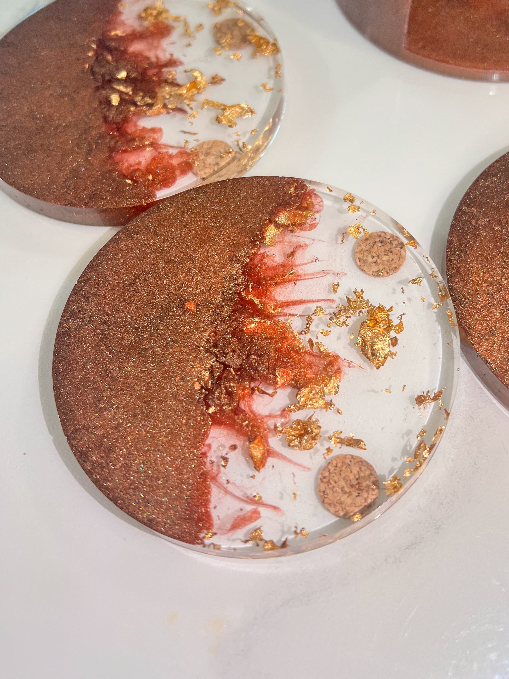 Golden Brew Coasters, a set of four coasters with a matching base that will elevate your home decor. Each coaster is a unique blend of clear resin embedded with shimmering gold flakes, paired with a rich coffee-colored mica powder. The base, crafted entirely in a luxurious coffee brown, perfectly complements the coasters, making this set a stunning addition to any table setting. Whether you're enjoying a morning coffee or an evening drink, the Golden Brew Coasters add a touch of elegance and sophistication. Make every sip special with these beautiful, handcrafted pieces. Order now and bring a golden touch to your home!