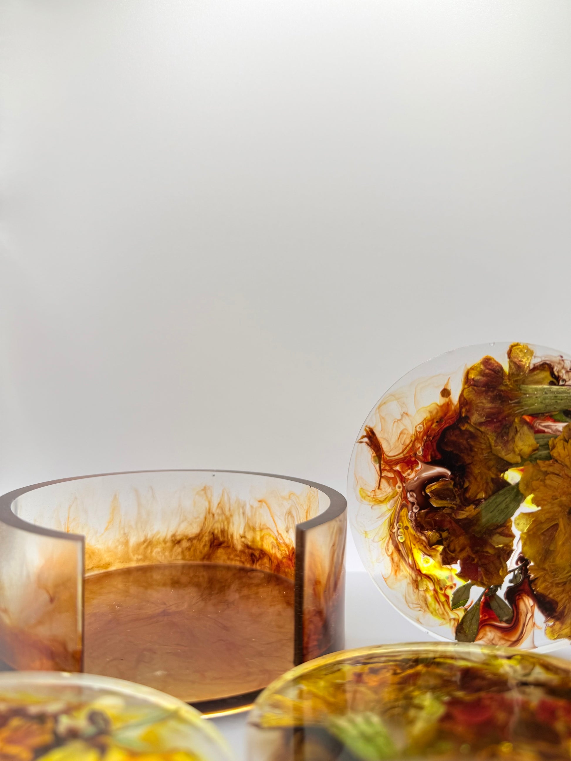 Bring a touch of timeless nature into your home with this 4-piece coaster set, handmade with pressed marigolds grown right from my garden. Each coaster is preserved in resin, capturing the golden warmth of fall and the vintage charm of natural florals.