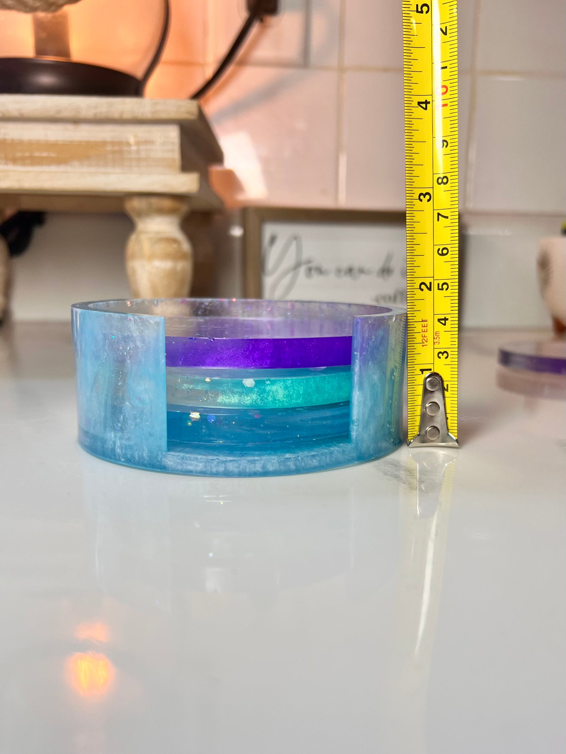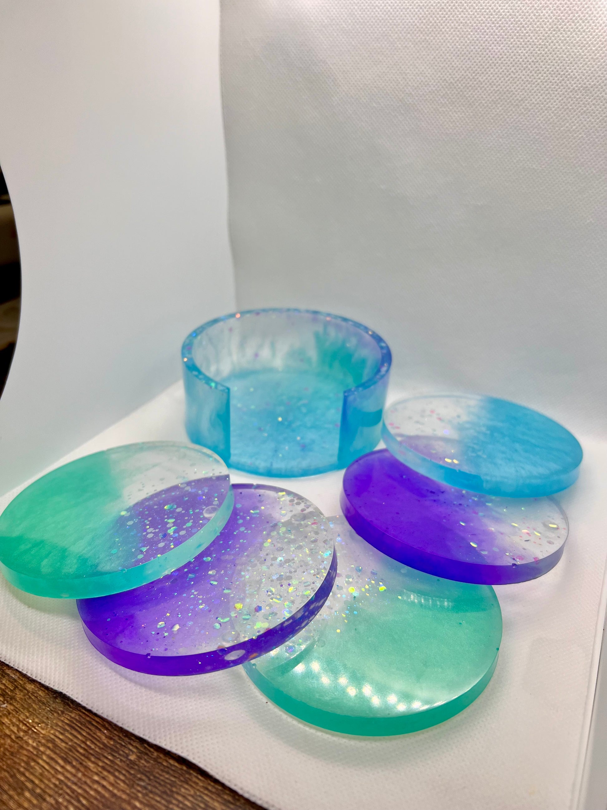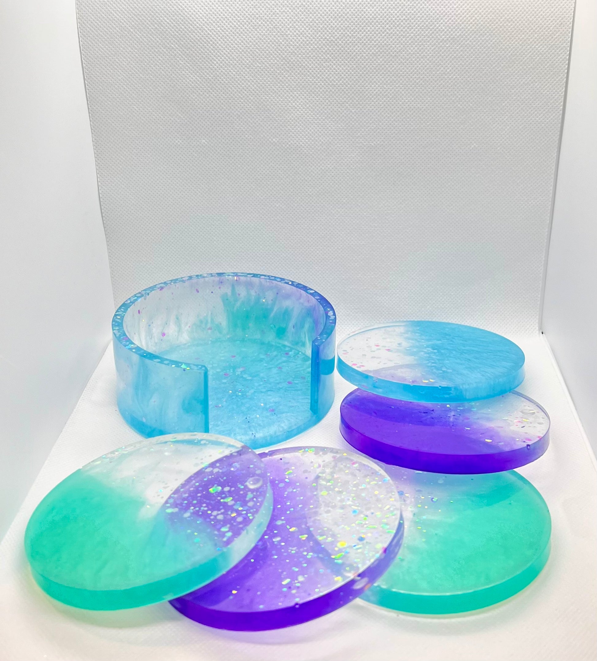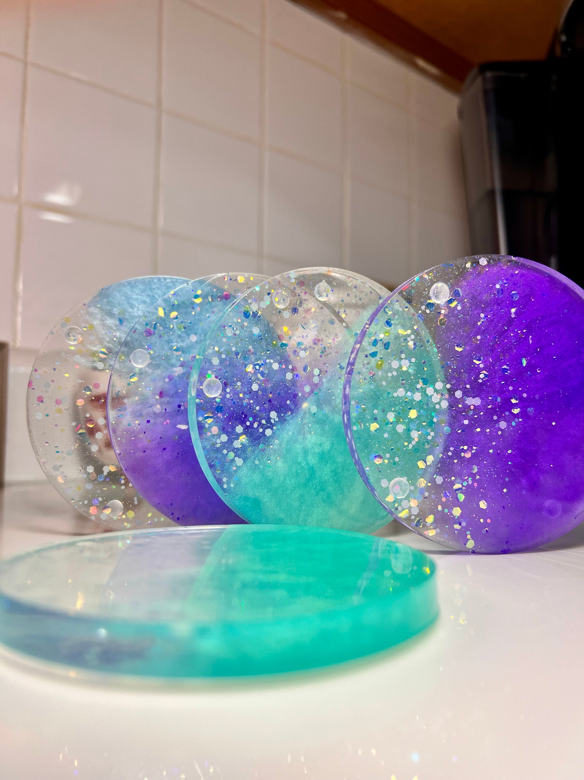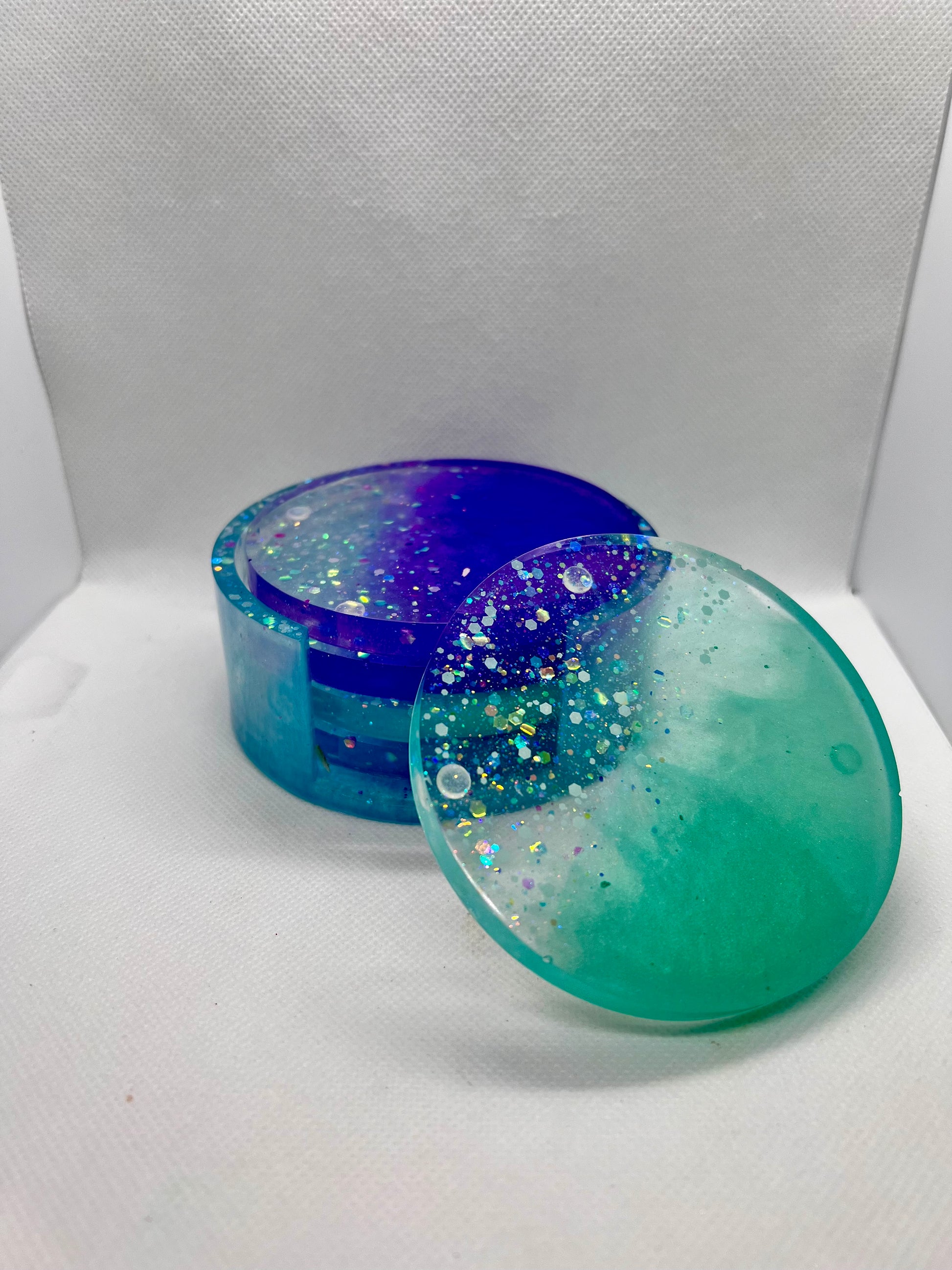 Introducing my Mermaid Magic coaster Set! This enchanting 5-piece set of circle coasters, complete with a sleek base, is crafted with vibrant colors that scream mermaid vibes. Perfect for adding a touch of whimsical elegance and fun to your home decor, these coasters are not only functional but also a delightful conversation starter. Protect your surfaces in style with my Mermaid Magic Coaster Set – a must-have for any mermaid lover!