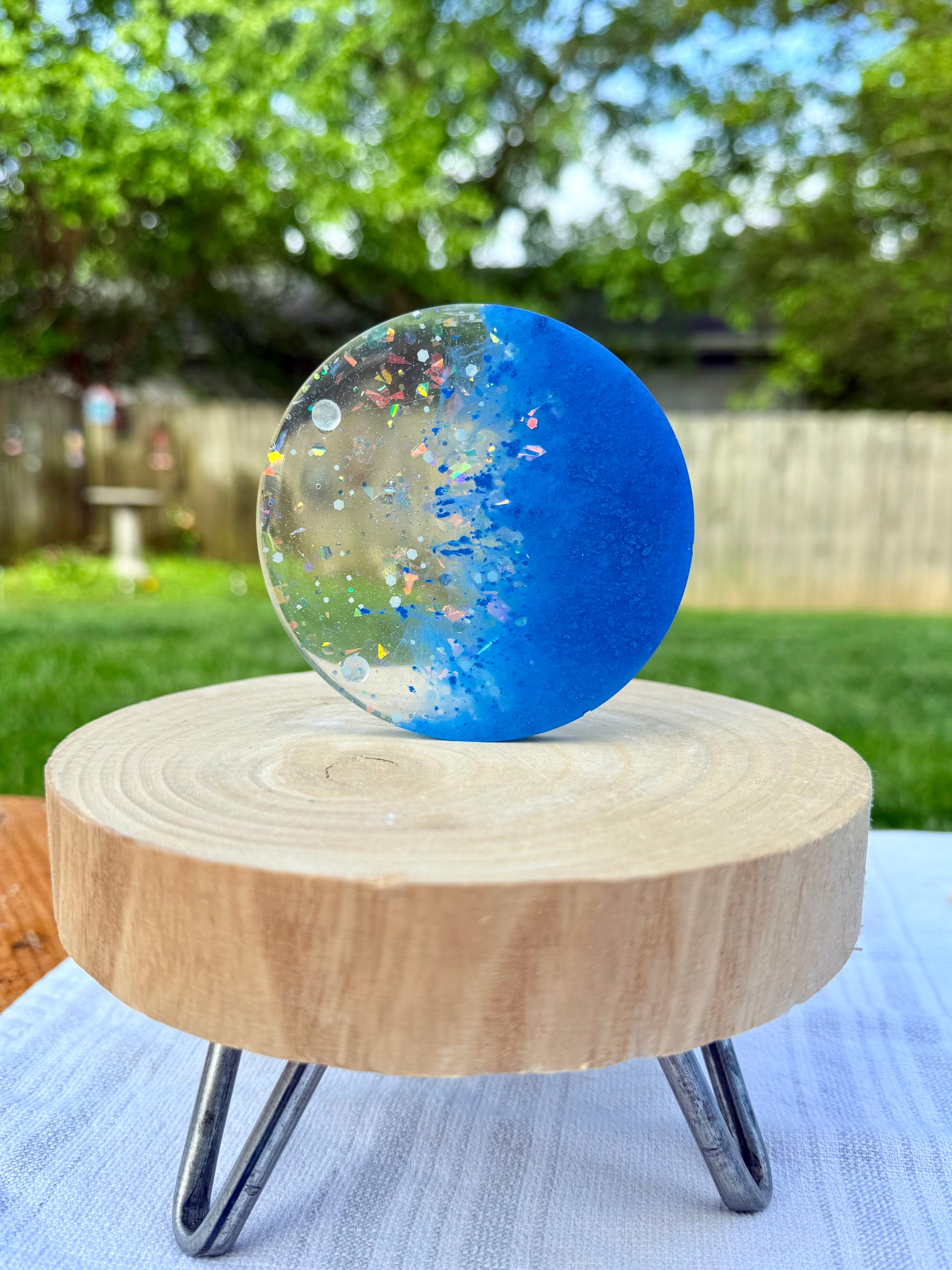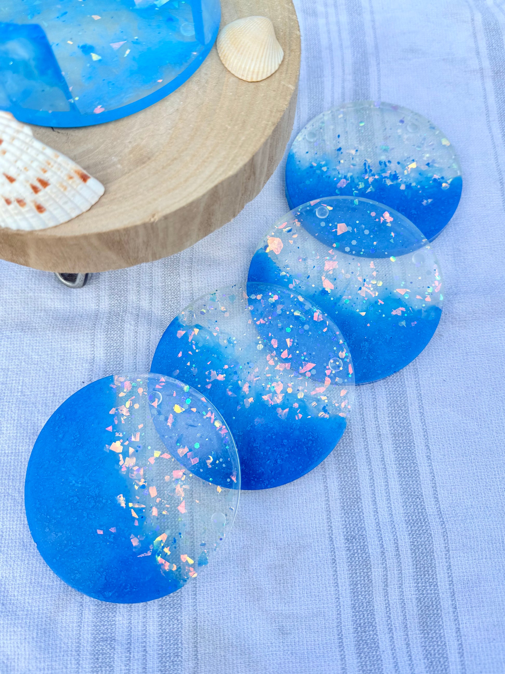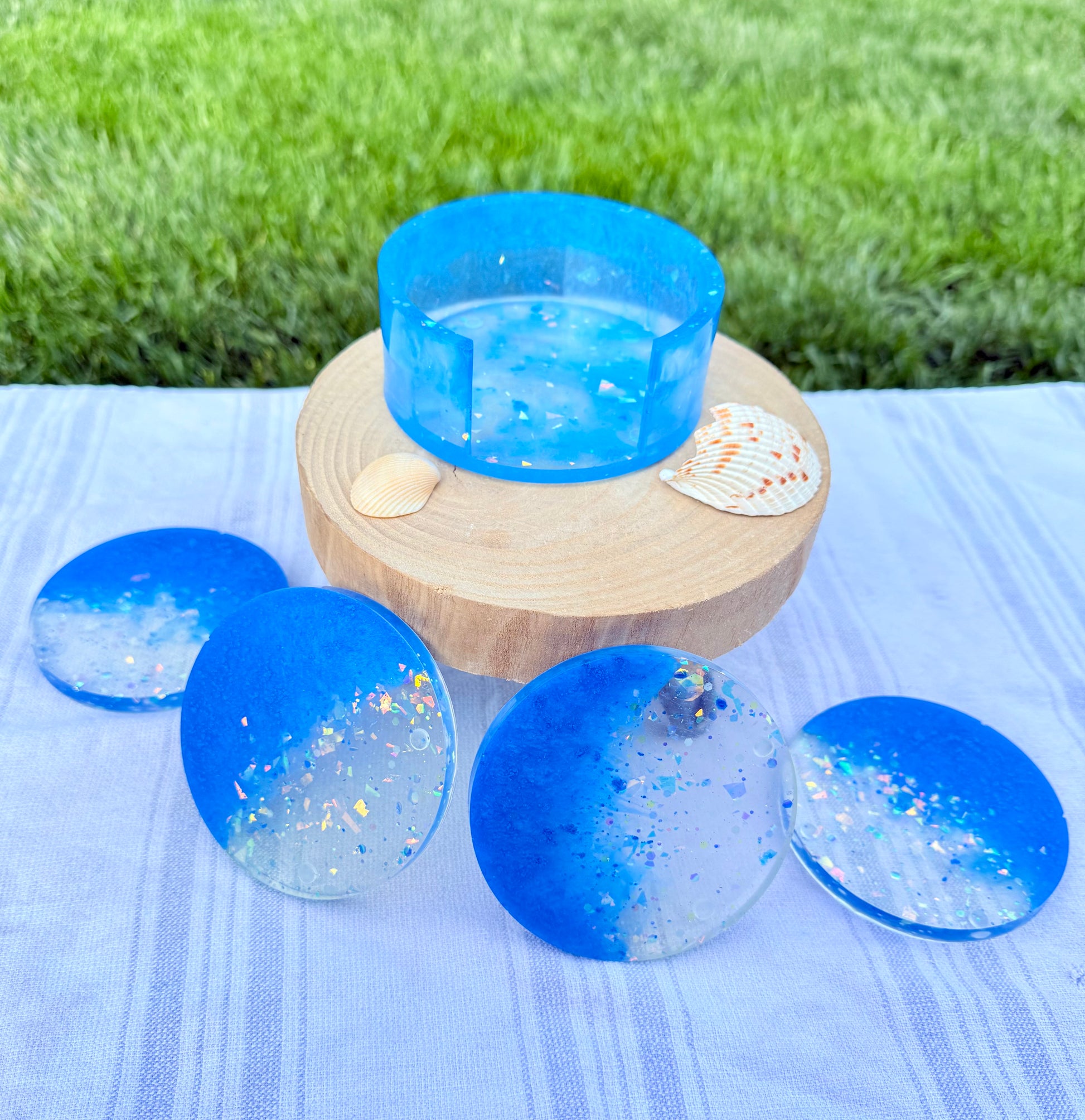 This 4-piece resin coaster set with matching base features a dreamy blend of deep blue mica and clear resin packed with shimmer. Ocean vibes meet night sky sparkle—perfect for adding a splash of magic to your table.