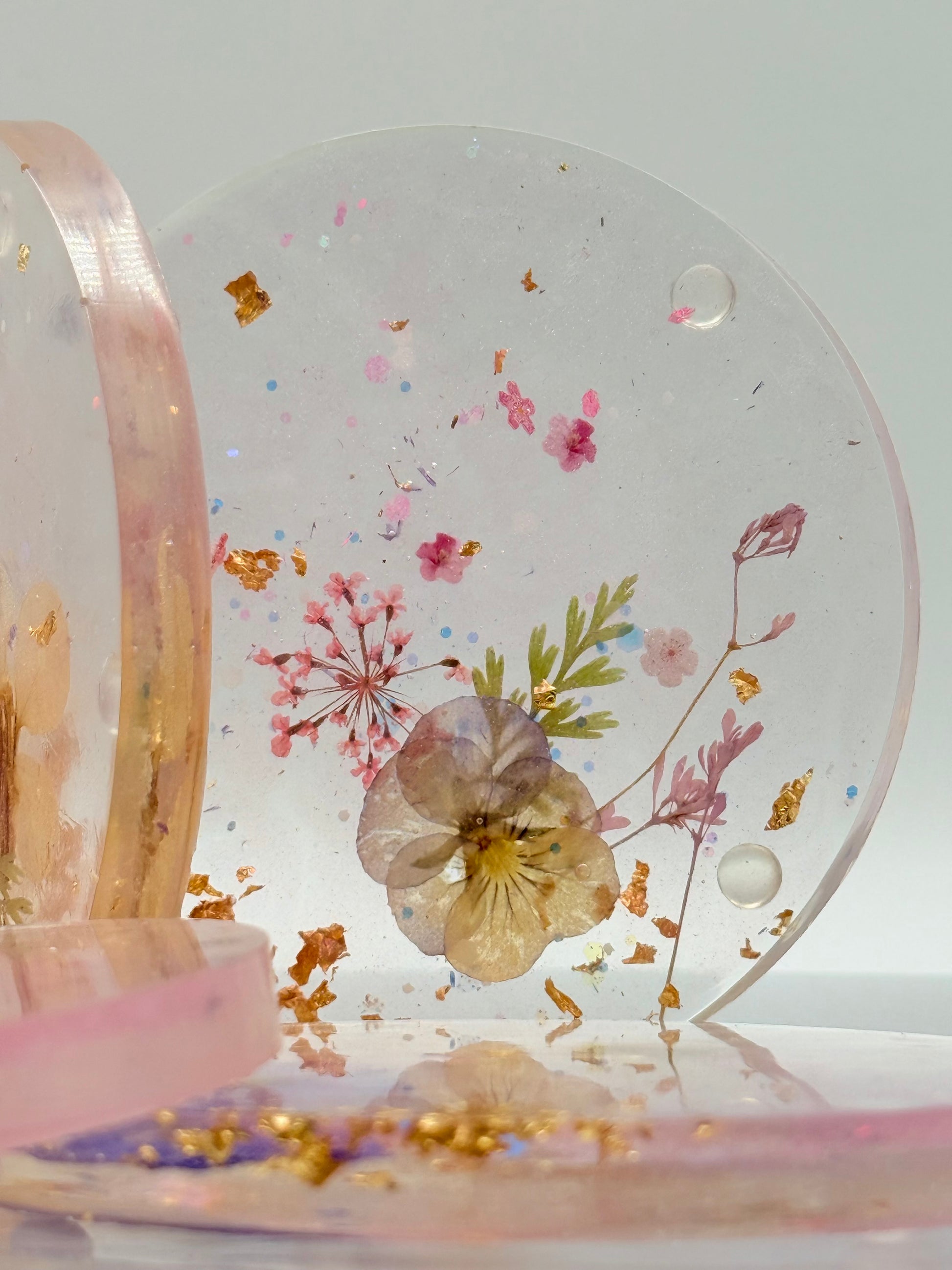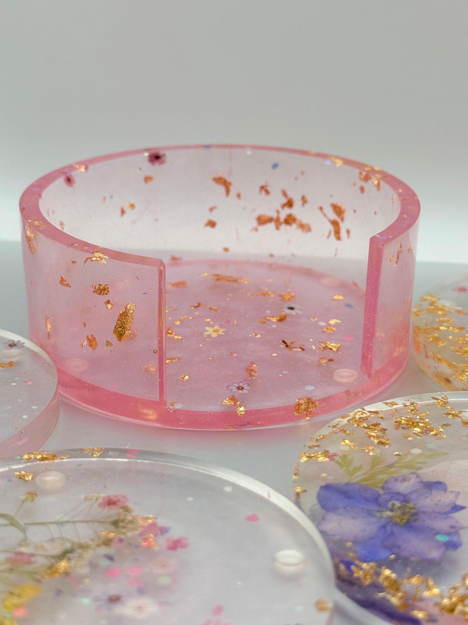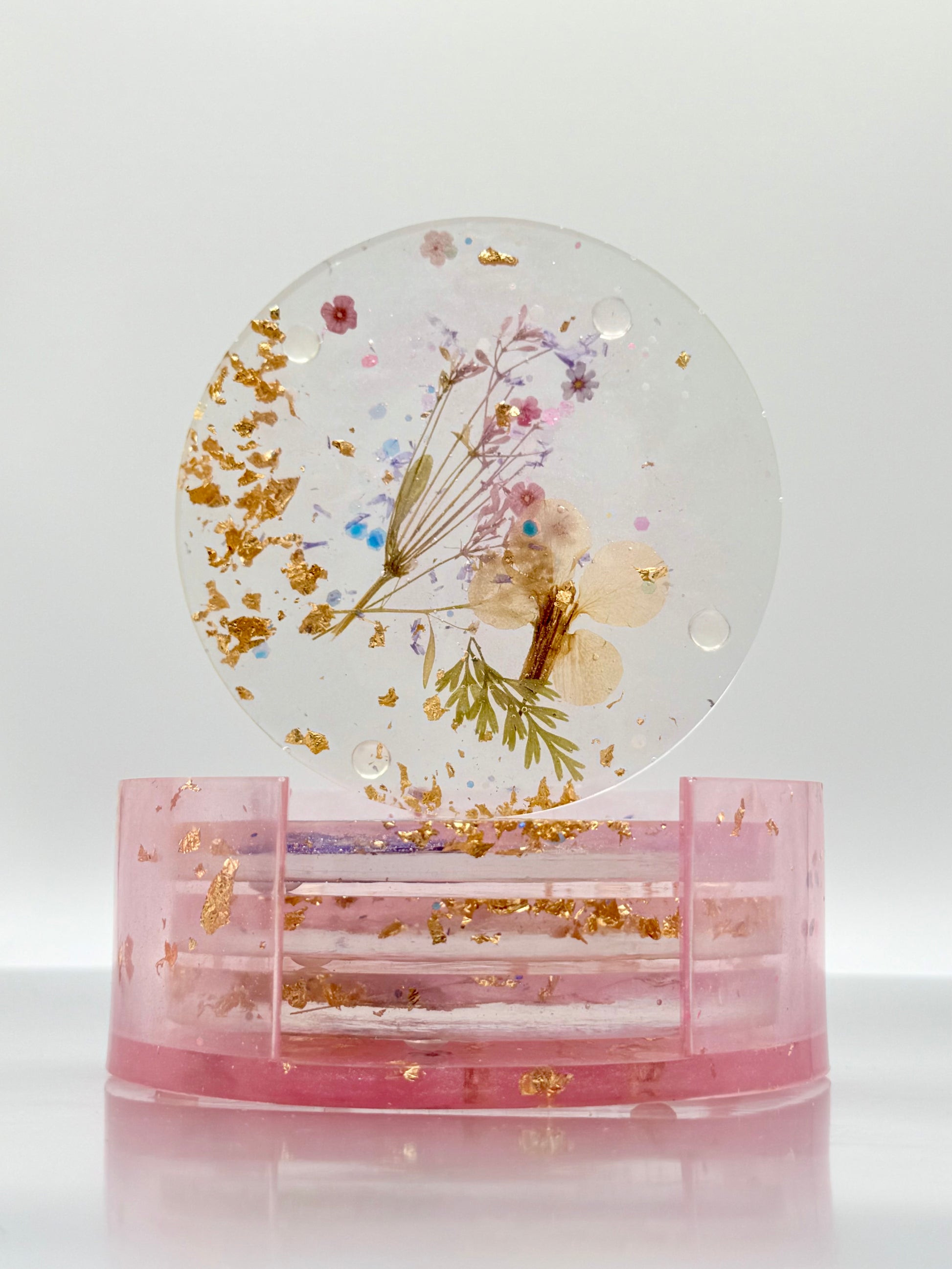 Bring a touch of nature indoors with this handcrafted resin coaster set featuring real dried wildflowers, shimmering gold flakes, and soft pink tones. Each set includes four unique coasters and a matching holder—no two pieces are ever the same.